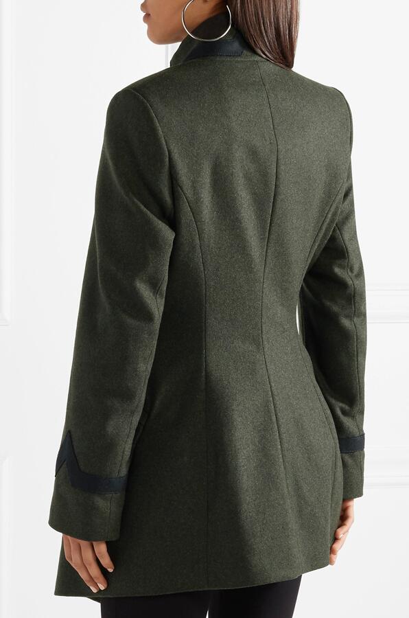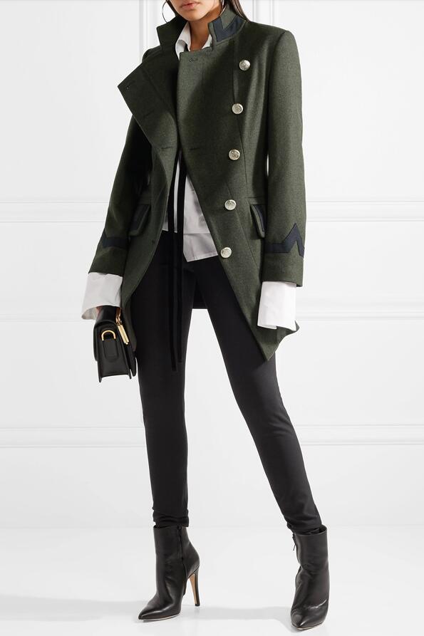 Réjouissez-vous de l’alliance parfaite de la mode et de la fonction avec ce manteau sophistiqué en laine vert militaire pour femme. Doté d’un design militaire moderne avec un col montant accrocheur, cette pièce magnifiquement taillée est spécialement conçue pour flatter toutes les silhouettes. Confectionné à partir de généreuses quantités de tissus en laine, ce manteau vous tiendra chaud tout en offrant une coupe impeccable. La texture luxueuse de la laine ajoute un air d’élégance où vous allez. Du bureau au dîner en ville, créez des allures saisissantes, mais intemporelles grâce à l’attrait captivant de ce manteau vert militaire à coupe étroite.